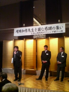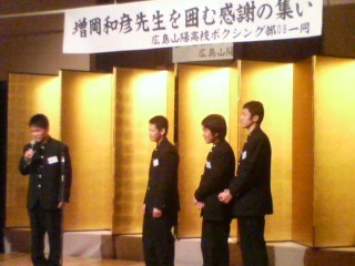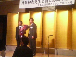 平成21年2月22日、広島山陽高校ボクシング部監督、増岡先生の定年退職を受けて、広島全日空ホテルに於いて『増岡和彦先生を囲む感謝の集い』がとり行われ、広島山陽高校ボクシング部OBの栗原コーチが出席いたしました。